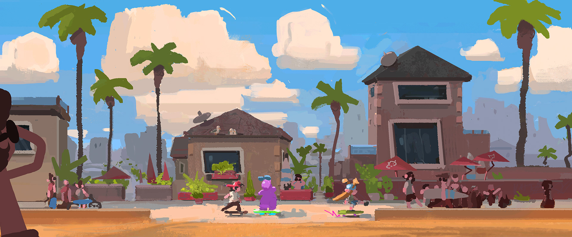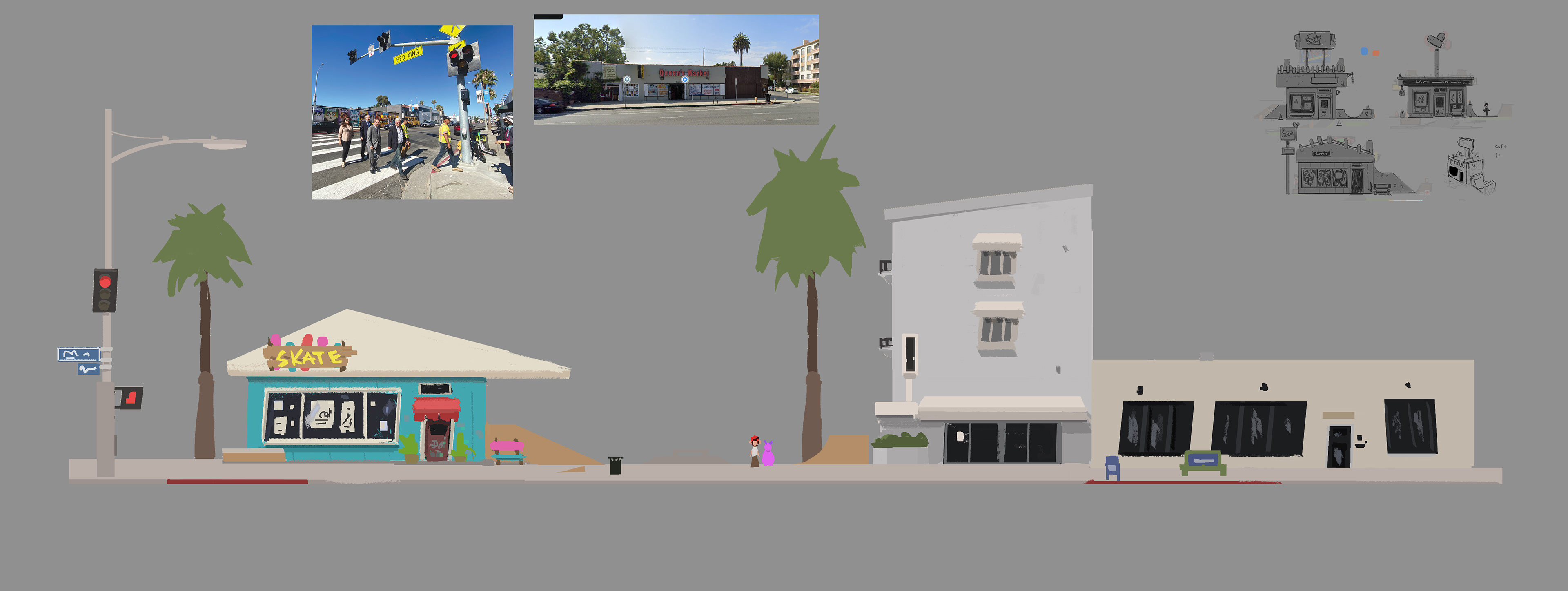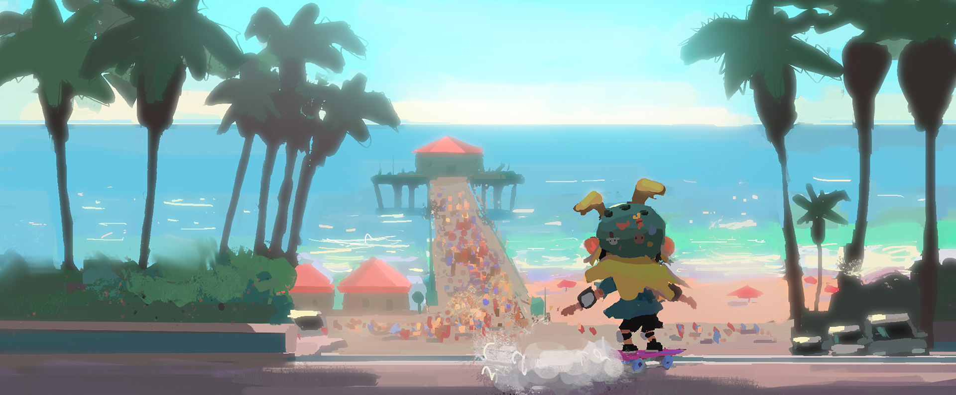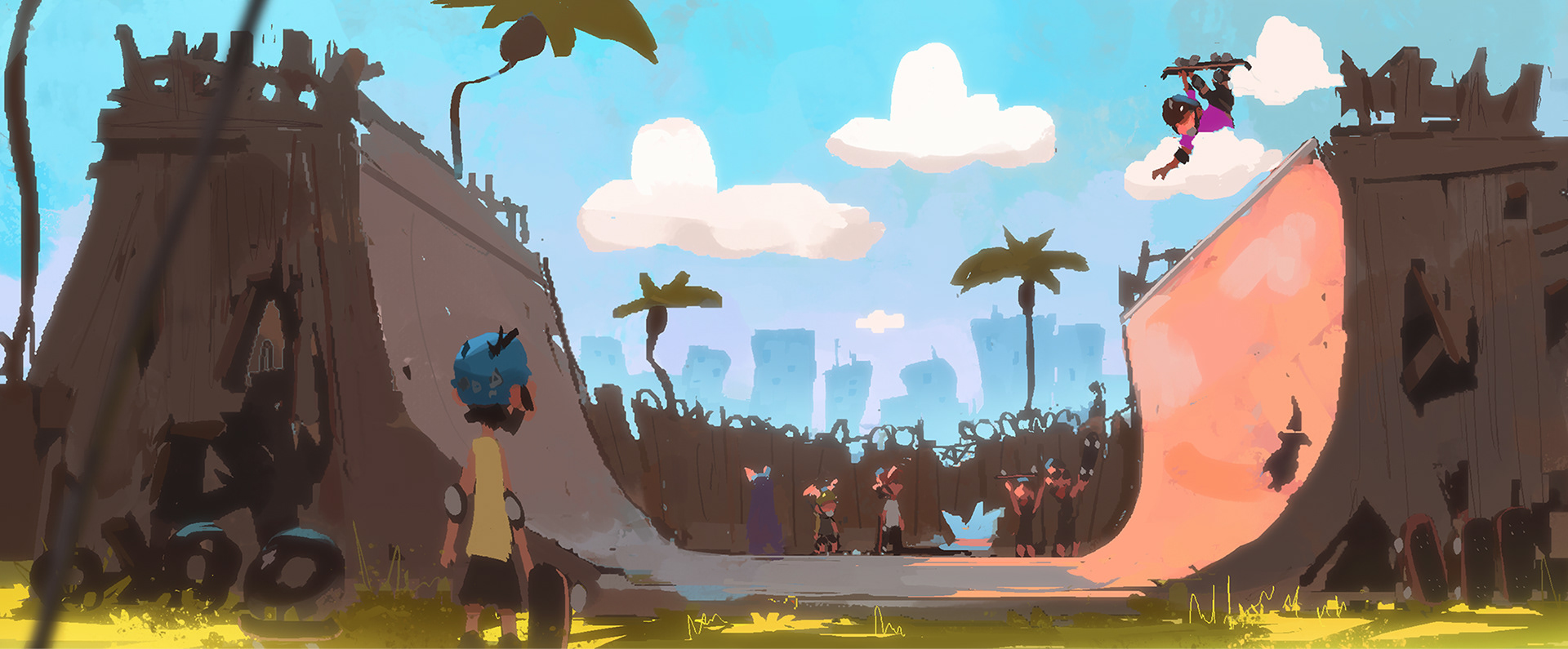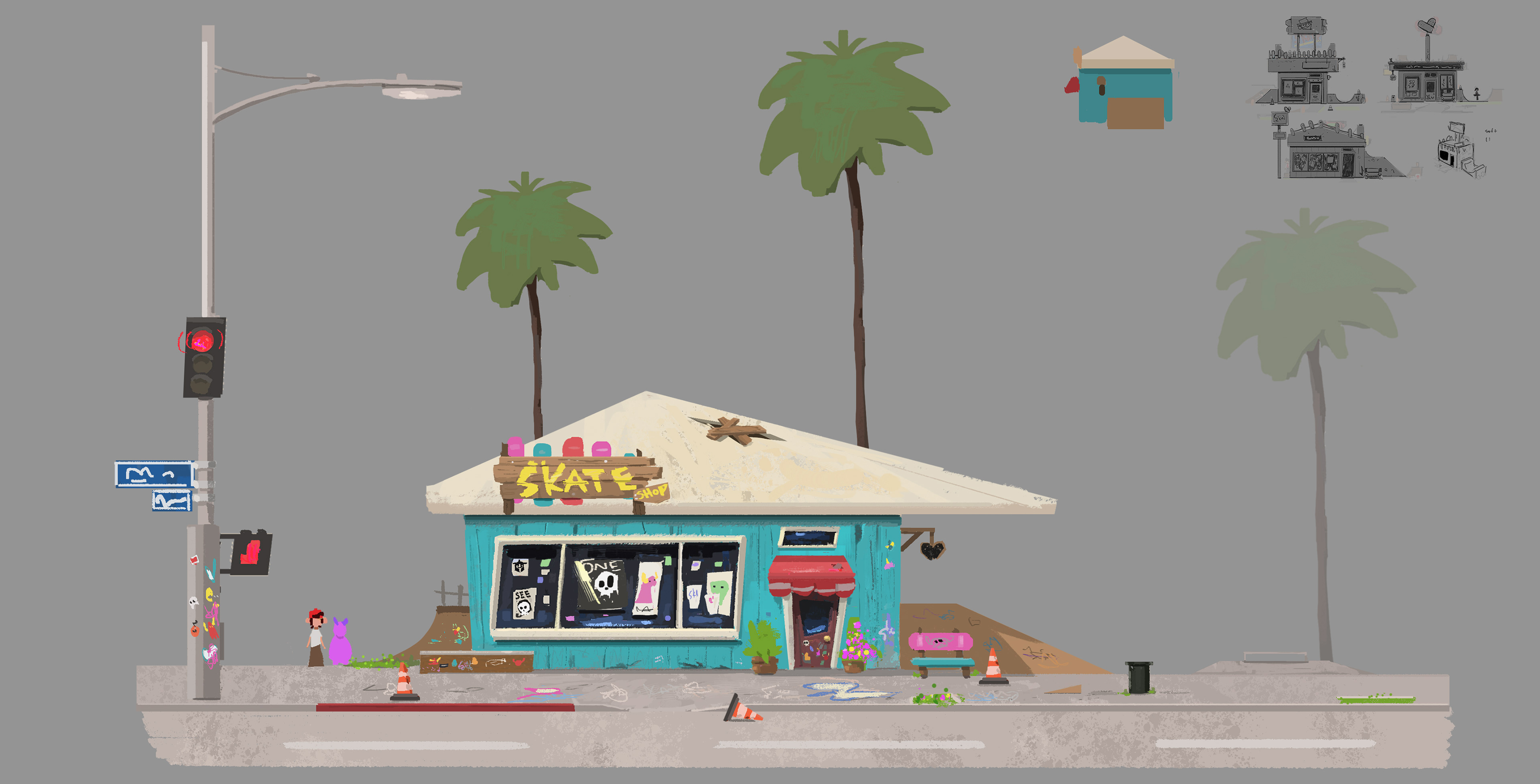 Sk8 is a personal project about an Alien from outer space discovering skateboarding and wanting to become a pro skater. Mr. Alien travels down to earth and meets skaters and go on adventures. I focused on color keys and some set designs. I will post those soon just having fun painting more ideas.